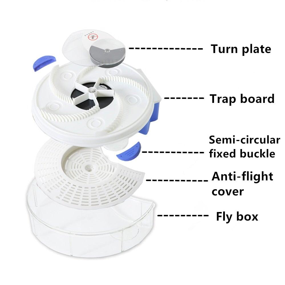 USAGE: Place sugar water or soft crumbs of food in the five bait stations located on the trap. When the flies are feasting, the rotating arm sweeps over them to trap them inside. Unplug the red stopper on the bottom to empty tray.